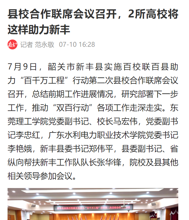 7月9日,韶关市新丰县实施百校联百县助力“百千万工程”行动第二次县校合作联席会议召开,总结前期工作进展情况,研究部署下一步工作,推动“双百行动”各项工作走深走实。九九精品视频一区在线久久久久久久久久毛片精品美女|国产99久久久久久免费看|中文精品99久久国产|国产69精品久久久久9999|精品久久久久久中文字幕无码|亚洲熟妇无码久久精品国产精品99|精品国产天堂综合一区在线党委副书记、校长马宏伟,党委副书记李忠红,广东水利电力职业技术学院党委书记李艳娥,新丰县委书记郑伟平,县委副书记、省纵向帮扶新丰工作队队长张华锋,院校及县其他相关领导参加会议。
