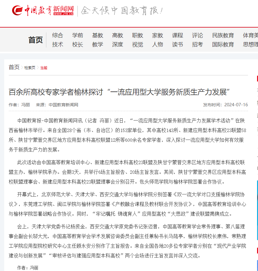 中国教育报-中国教育新闻网讯(记者 冯丽)近日,“一流应用型大学服务新质生产力发展学术活动”在陕西省榆林市举行。来自全国28个省(市、自治区)的153家单位,其中高校143所、新建应用型本科高校23联盟58所、陕甘宁蒙晋交界区地方应用型本科高校联盟12所等600余名专家学者,深入探讨一流应用型大学如何有效服务于新质生产力的发展。