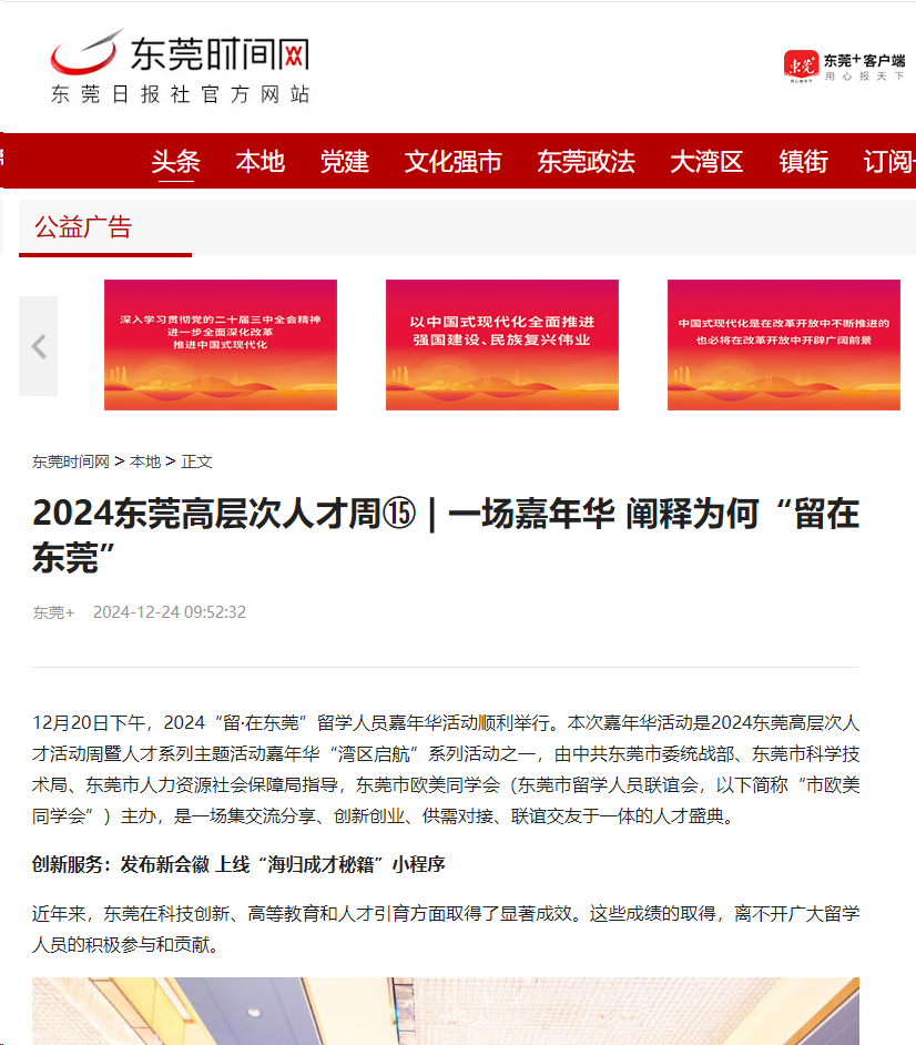 12月20日下午,2024“留·在东莞”留学人员嘉年华活动顺利举行。本次嘉年华活动是2024东莞高层次人才活动周暨人才系列主题活动嘉年华“湾区启航”系列活动之一,由中共东莞市委统战部、东莞市科学技术局、东莞市人力资源社会保障局指导,东莞市欧美同学会(东莞市留学人员联谊会,以下简称“市欧美同学会”)主办,是一场集交流分享、创新创业、供需对接、联谊交友于一体的人才盛典。