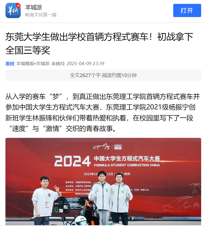 林振锋心里一直有个赛车梦。还在读中学时,他便留意到了中国大学生方程式汽车大赛(以下简称为“FSC”)。这个竞赛被誉为“大学生版F1”,要求参赛者在一年周期内完成从概念设计到实车落地的全过程。2021年,林振锋踏入莞工校园,内心对FSC的向往更加强烈。