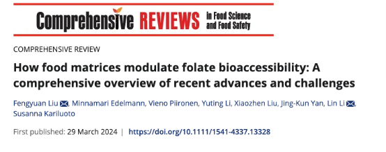 2024年3月,我校生命健康技术学院李琳教授团队在国际食品顶级期刊Comprehensive Review of Food Science and Food Safety在线发表题为How food matrices modulate folate bioaccessibility: A comprehensive overview of recent advances and challenges的综述文章。刘丰源助理研究员为论文第一作者,李琳教授为通讯作者。