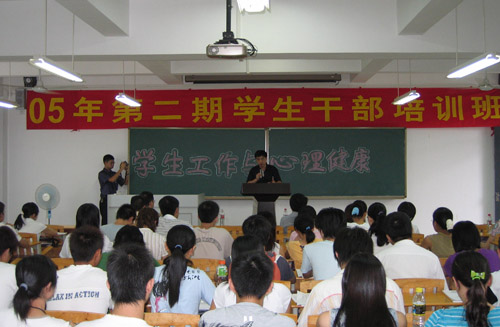 为提高学生干部的综合素质和业务能力,加强对助理班主的培养、教育和指导,8月27日至28日,院学生处举办了为期两天的“2005年第二期学生干部培训班”,科研处路晓军副处长和政法系曹淑英老师针对“学生工作与心理健康”这一主题举办了专题讲座,向参加培训的同学介绍了大学生常见的心理问题以及应对办法。