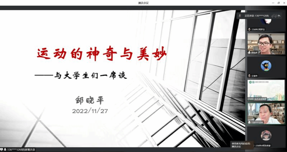 为引导低年级学生重视体育锻炼,及早抓住大学时光养成运动习惯,提升精神状态,促进全面发展,11月27日晚,材料科学与工程学院邀请学校原副校长邹晓平研究员做客第六期“材料·科学·人生”论坛,分享《运动的神奇与美妙》。本次论坛在腾讯会议平台举行,全体辅导员、2022级班主任及全体学生、2021级班委成员、学生组织体育部成员等近300人参加。